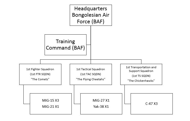 Training Command Bongolesian Air Force: (TCBAF): On orders from HQBAF, oversees all personnel training and assignment operations, to include pilot, ground crew, support, flight, and weapons training.